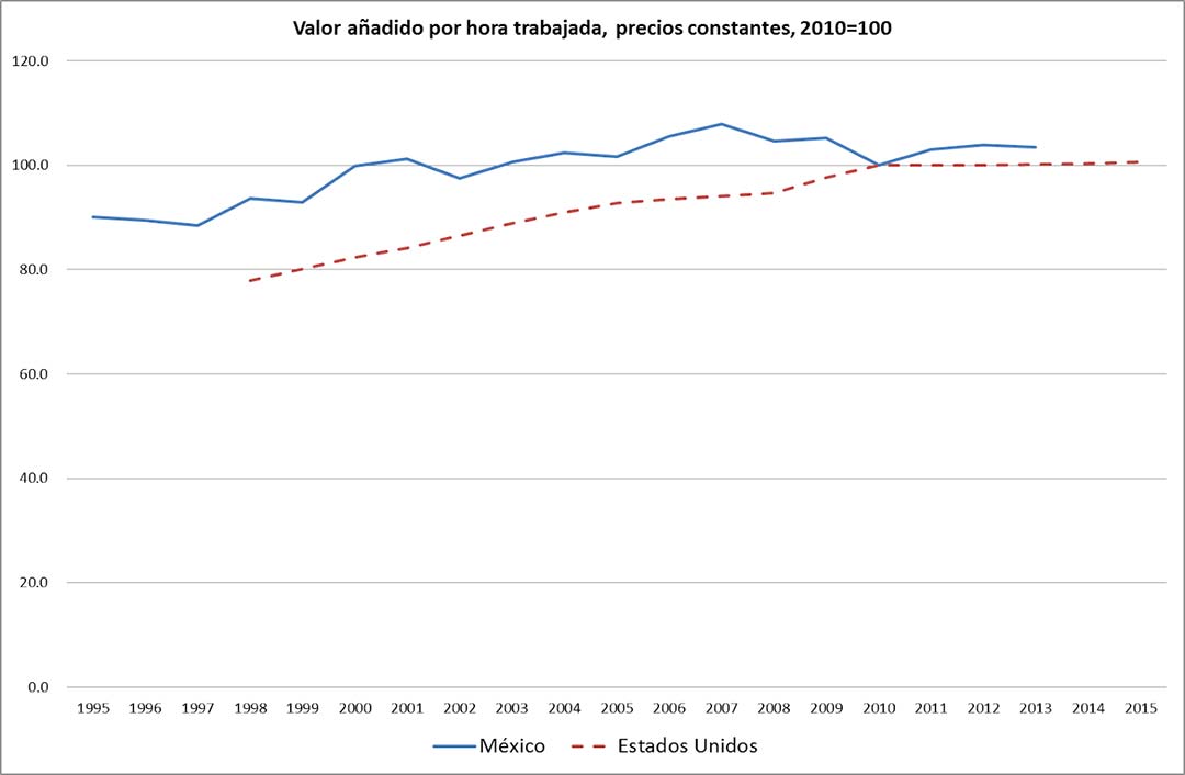 En lo que se refiere a los costos laborales, medidos como la compensación laboral por hora trabajada, su tendencia indica que, entre 1995 y 2003, el alza en los costos laborales fue mayor en México que en Estados Unidos, mientras que su ritmo de crecimiento fue similar al estadunidense desde entonces. Esto es, mientras que en los primeros años del TLCAN los salarios en México experimentaron cierto aumento, en parte como compensación por la pérdida ocasionada por la crisis de 1994, queda muy claro que no ha habido la tan esperada convergencia de salarios como inicialmente se había vendido.