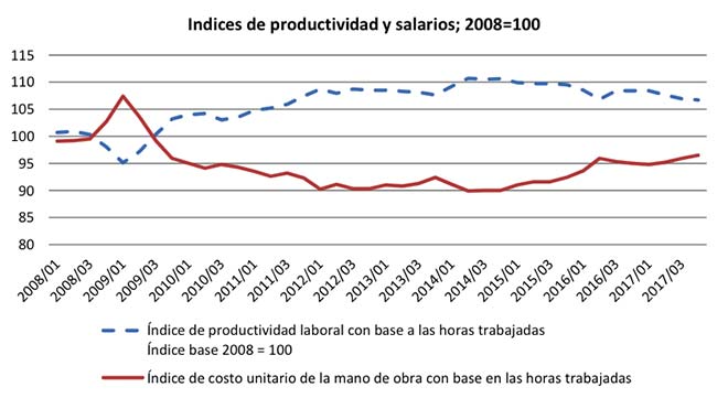 Gráfico 3. Índices de productividad y salarios en el sector manufacturero