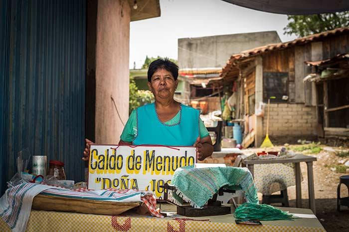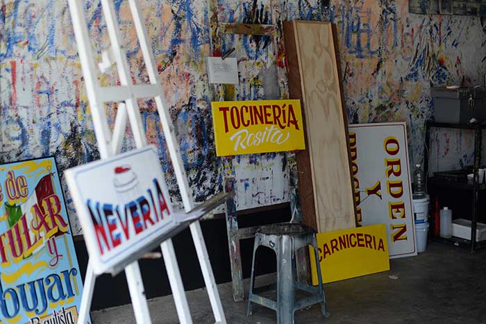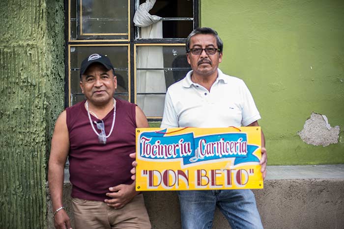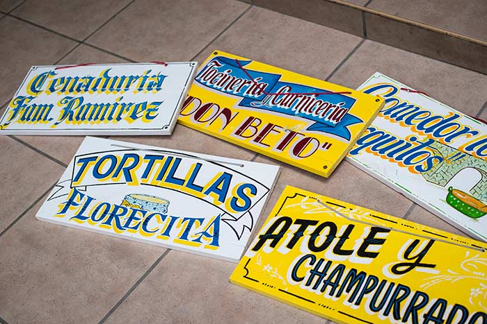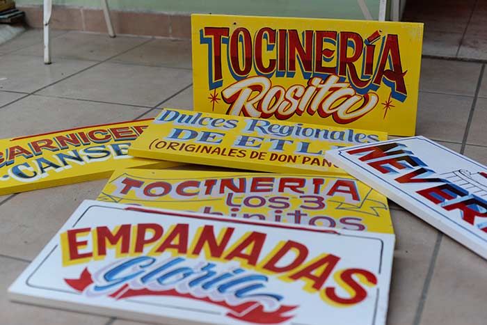 Lo hicieron pensando en el tipo de negocio y la personalidad de los dueños. Para Don Beto, por ejemplo, un hombre callado y serio, dueño de una carnicería, se decidieron por una fuente sobria y elegante estilo art decó. A veces las decisiones eran más complicadas ya que algunos puestos no tenían nombre. ¿Qué letrero darle a la señora Flor, que desde su casa vende tortillas? Se decidieron por ‘Tortillas Florecita’, con letras en verde y amarillo que recuerdan la marca de harina de maíz ‘Maseca’.