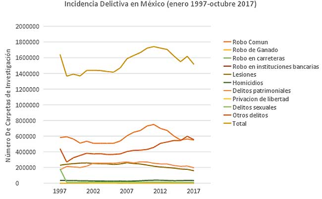 Haciendo a un lado las reservas anteriores sobre los datos estadísticos, aún es posible esbozar ciertas tendencias sobre la incidencia delictiva en nuestro país. Una de las tendencias más notables es la relativa estabilidad de la incidencia delictiva total desde que se inició el registro de datos. En 1997, el total nacional de nuevas carpetas de investigación rondaba los 1.64 millones; para 1998, el número bajó a 1.36 millones. El máximo histórico de nuevas carpetas de investigación se registró en 2011 con 1.74 millones de carpetas. Desde 2011, la tendencia ha sido decreciente con un ligero pico registrado en 2016 que rondó el 1.62 millones de nuevas carpetas de investigación. Aun enfocados en el total nacional de nuevas carpetas de investigación, es posible atisbar un incremento vertiginoso a partir de 2006 que coincide con el despliegue del ejército por parte de Felipe Calderón.