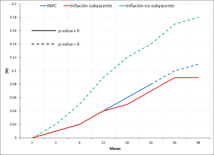 Con información de junio de 2001 a diciembre de 2018, Angeles Galvan, et al., (2019) publican el modelo VAR más reciente en el tema. De acuerdo con las funciones impulso-respuesta, un choque positivo de uno por ciento al tipo de cambio aumenta (en los primeros 12 meses) la inflación general y subyacente 4%, mientras que la inflación no subyacente no es estadísticamente diferente de cero (figura 1). Para las dos primeras variables, el impacto depreciativo del tipo de cambio se desvanece a los 24 y 48 meses después del choque, respectivamente.