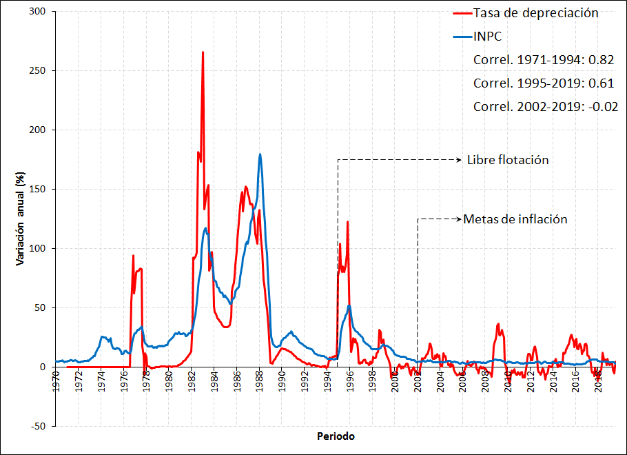 Por la literatura analizada, los choques positivos del tipo de cambio sobre distintos subíndices del INPC han disminuido considerablemente su nivel de contagio, una vez adoptada la estrategia de metas de inflación: de 63% en 1997-2001, el coeficiente de traspaso desciende (por debajo del promedio internacional) hasta 4% en 2001-2018. En la evidencia empírica estimada, la relación directa “depreciación cambiaria-tasa de inflación” a lo largo del periodo sin libre flotación, arroja un coeficiente de correlación más alto en comparación con los años posteriores a la liberación del tipo de cambio: 0.82 de 1971-1994 y 0.61 de 1995-2019.