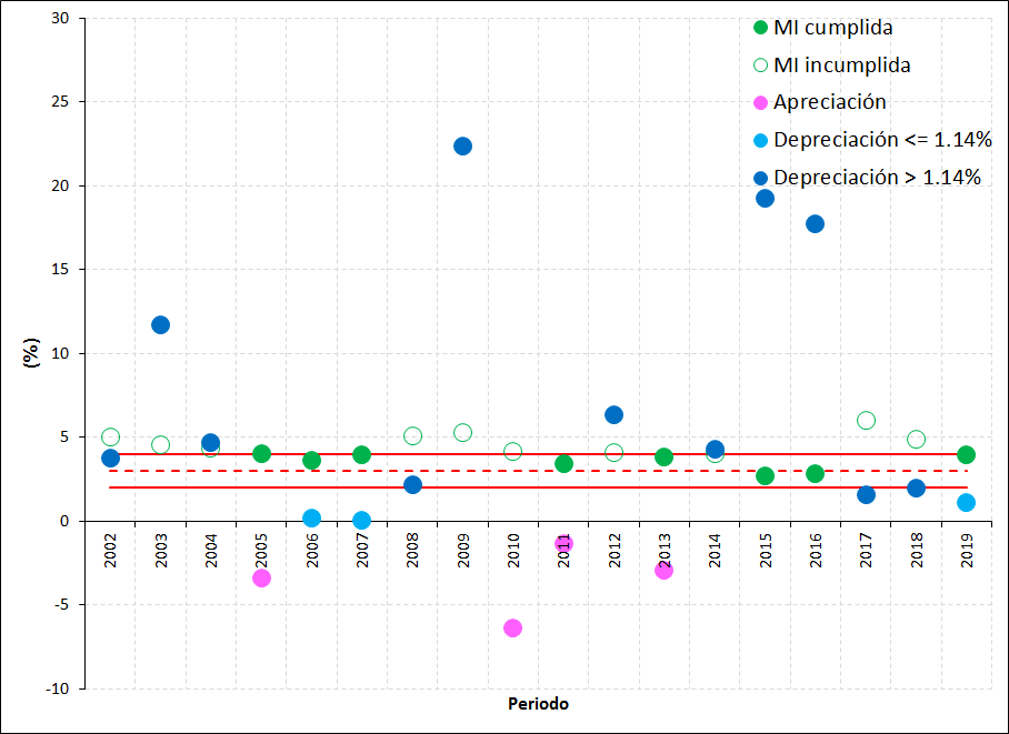 Tomando como referencia los últimos dieciocho años que han existido las MI, únicamente ocho de ellos obtienen el objetivo deseado (figura 3). Del total de años que satisfacen la meta de 3% +/- 1%, el tipo de cambio nominal cumple con alguna de las siguientes regularidades: (i) se aprecia su valor con respecto al año previo (2005, 2011 y 2013); o (ii) la depreciación cambiaria es menor (o igual) a 1.14% (2006, 2007 y 2019). Contrario a lo esperado, 2015 y 2016 tienen una depreciación promedio del 18% que no irrumpe el cumplimiento de la estabilidad monetaria.