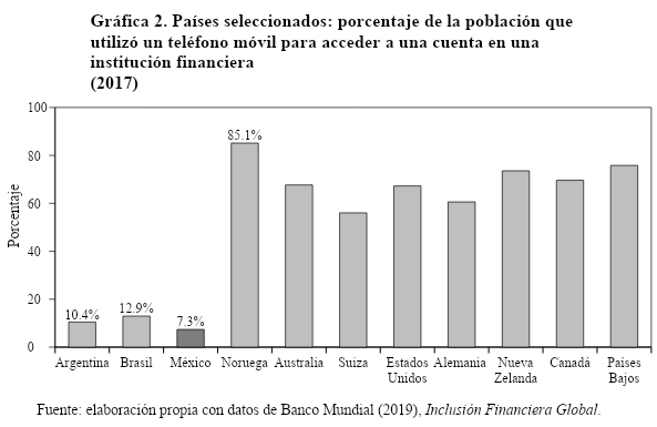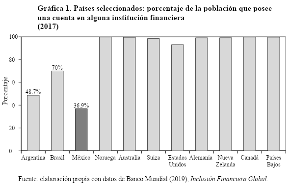 Basta con dar un vistazo a algunas estadísticas básicas del Banco Mundial (2019) para darnos cuenta de la evidente exclusión en el acceso a los servicios financieros a la que se enfrentan los mexicanos. En la Gráfica 1 podemos observar el porcentaje de personas que cuentan con una cuenta en un banco o alguna otra institución financiera para una muestra de países seleccionados que incluye a Argentina, Brasil, México, Noruega, Australia, Suiza, Estados Unidos, Alemania, Nueva Zelanda, Canadá y Países Bajos, de acuerdo con datos del Banco Mundial (2019) para el año 2017, la cifra más reciente disponible en su base de datos. En este sentido, todos los países desarrollados que aparecen en la Gráfica 1 muestran porcentajes mayores al 90 %, mientras que en México sólo el 36.9 % de la población posee una cuenta en una institución financiera, aun por debajo de Argentina y Brasil, que presentaron valores de 48.7 % y 70 % respectivamente.