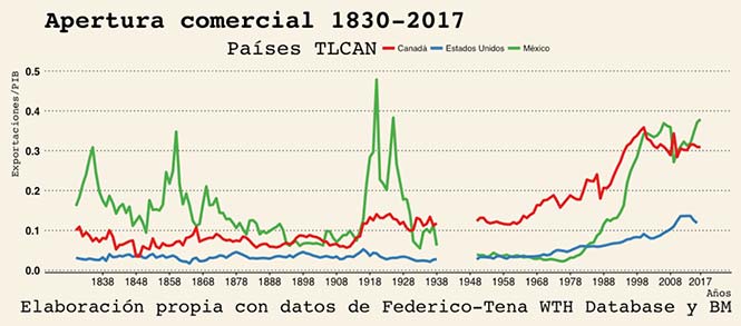 Gracias a una nueva base de datos sobre el comercio mundial desde principios del siglo XIX2 desarrollada por Giovanni Federico y Antonio Tena-Junguito, de las universidades de Pisa y Carlos III de Madrid respectivamente, podemos hacernos una idea de esta evolución. Para los propósitos de este texto nos importa la medición de apertura comercial que data desde 1800 hasta 2008 y que para los tres países en cuestión cubre el periodo de 1830-2008; sin embargo, utilizando datos del Banco Mundial podemos completar hasta 2017.