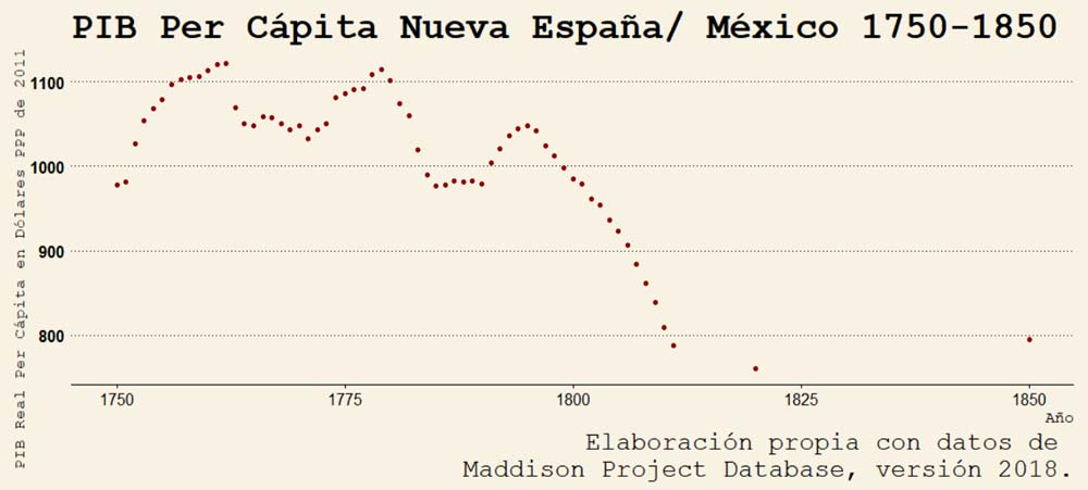 De acuerdo con Coatsworth (1989),9 la Independencia le costó 4.2 puntos del PIB a México y 21 por ciento del PIB per cápita, equivalente a un decrecimiento del ingreso per cápita de medio punto por año entre 1820 y 1845, de acuerdo con Salucci y Salvucci (1993)10 el costo fue 50 por ciento del producto. Sumado a este costo, décadas de conflictos internos, intervenciones extranjeras y falta de integración de un mercado nacional produjeron un estancamiento de tres décadas.