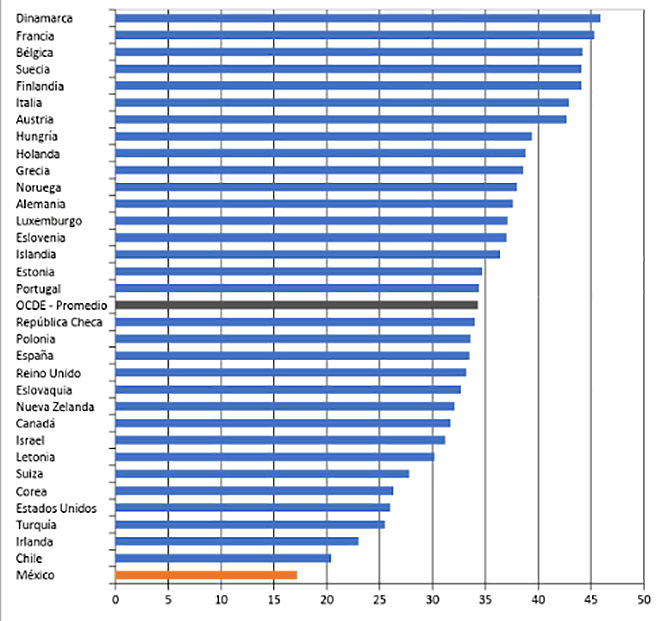 ¿Hace esto un poco de eco en el caso de México? De entrada, México es el peor recaudador de impuestos de los países de la OCDE y de los últimos lugares incluso de América Latina.1 Con 17.2% de recaudación del PIB, México está muy lejos del promedio de recaudación de la OCDE (34.3%).