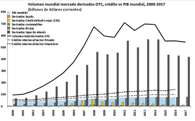 En la gráfica, en color azul-cielo-de-otoño, tenemos el producto interno bruto mundial (PIB) y en la línea continua negra el volumen total de los derivados negociados en el mercado OTC, ambos medidos en billones de dólares corrientes. En las barras, hemos desglosado el total de los derivados por su tipo. Mientras para el final de 2016 el PIB mundial sumaba USD 76 billones, el valor de los derivados OTC era del orden de USD 553 billones. Nótese, en un solo mercado, tenemos que el valor monetario de los títulos derivados negociados supera más de siete veces el valor de lo que se produce en el globo. Si hubiéramos adicionado al valor de los derivados OTC el montante dinerario de los derivados bursatilizados, de las acciones y debentures de las compañías privadas, y a los títulos de la deuda pública, la distancia entre la nube financiera y el valor de la producción real sería aún mayor. Además, en las líneas puntilladas, evidenciamos la cantidad de crédito otorgado al sector privado financiero y no-financiero. De los hechos estilizados presentados hay implicaciones teóricas fundamentales para la reflexión sobre cómo se caracteriza la acumulación de capital en el marco de la financiarización, pero que sobrepasan el espacio que aquí disponemos. Nada más para dejar una probadita en forma de provocación para los marxistas en guardia: si el capital ficticio se define por ser la apropiación del flujo de la ganancia futura exclusivamente generada en el proceso de producción, ¿cómo en el tiempo, de manera constante, se sigue ampliando la brecha entre el montante monetario de la producción real vis-à-vis los recursos que se mueven en la estratósfera financiera? Durand (2017:119-150) busca solucionar ese enigma, pero el argumento que desarrolla está lejos de ser unánimemente aceptado.