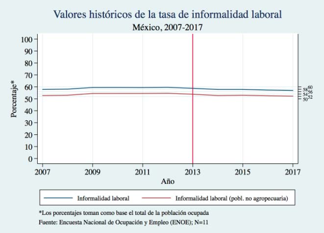 1 Para estimar el cambio restamos la tasa promedio de informalidad en 2013 (63.48) a la tasa promedio de informalidad en 2017 (62.2).