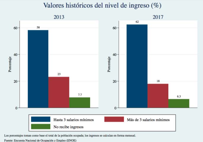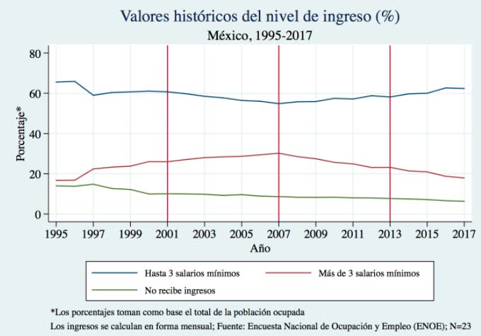 Primero, de 1995 a 2007, los ingresos por debajo de los 3 salarios mínimos disminuyeron y los ingresos mayores a tres salarios mínimos aumentaron. En cambio, en los seis años de la administración de Felipe Calderón y los cinco de Peña Nieto el porcentaje de trabajos de baja remuneración ha ido en aumento, mientras que el porcentaje de empleos pagados por encima de los tres salarios mínimos ha decaído marcadamente.