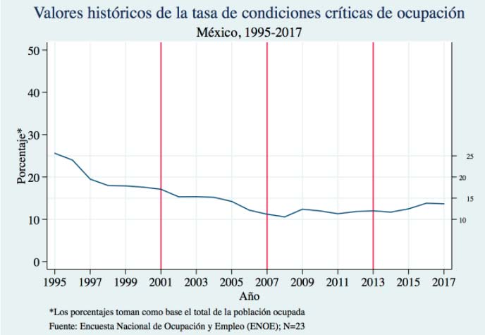 La precariedad laboral se refleja también en los niveles de lo que el INEGI define como condiciones críticas de ocupación, esto es, el porcentaje de los ocupados que trabajan menos de 35 horas a la semana, o que trabajan más de 35 horas, pero con ingresos mensuales inferiores al salario mínimo, o que trabajan más de 48 horas a la semana, pero por un ingreso mensual inferior a los dos salarios mínimos. Durante el periodo estudiado (1995-2017) observamos que el nivel más alto de condiciones críticas de ocupación ocurrió en el año de 1995. La tasa fue disminuyendo progresivamente hasta 2008, año en el que la tendencia se invierte, es decir, hay un aumento de la tasa de condiciones críticas de ocupación. Esta tendencia continuó durante el sexenio de Peña Nieto.5