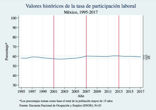 Finalmente, es importante notar que también la tasa de participación laboral mostró una clara continuidad durante el período 1995-2017. La tasa (calculada como el porcentaje de la población mayor de 15 años que posee un empleo) se movió en los 22 años considerados dentro de un rango que va del 57 al 60%.