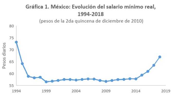 1. México efectivamente tiene uno de los salarios mínimos más bajos de la región norteamericana, y también de América Latina, sólo por debajo de México se encuentran los salarios de Venezuela. En 2018, el salario mínimo (nominal) vigente es de 88.36 pesos diarios (lo que significa 4.35 dólares estadounidenses al día), insuficiente para cubrir la línea de bienestar2 establecida por el Consejo Nacional de Evaluación de la Política de Desarrollo Social (CONEVAL). En México el salario mínimo real no alcanza ni para lo mínimo.