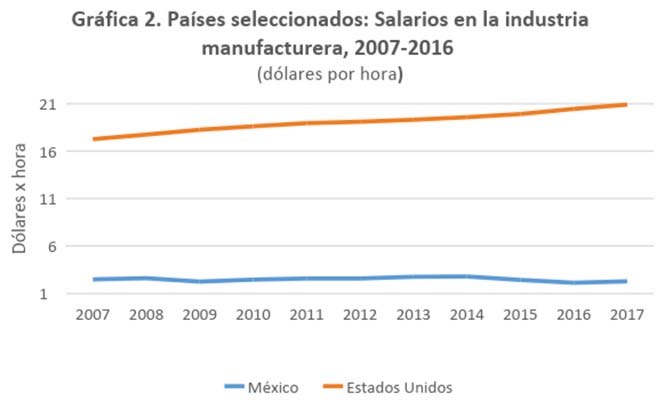 3. En términos de los salarios que están ligados a la manufactura, México también tiene uno de los salarios más bajos, sobre todo cuando se comparan con los que se pagan en países como Estados Unidos. En 2007 en México se pagaban 2.49 dólares la hora, mientras que, para ese mismo año, pero en EUA se pagaban 17.27 dólares la hora, es decir, en México se pagaba por la misma actividad manufacturera 6.93 veces menos. La situación empeoró para 2017, pues mientras que en México se pagaban 2.28 dólares la hora, en EUA se pagaban 20.90 dólares la hora; es decir, 9.15 veces menos por el mismo trabajo (ver gráfica 2). La tasa de crecimiento de los salarios pagados en la industria manufacturera mexicana fue NEGATIVA (1.5%)