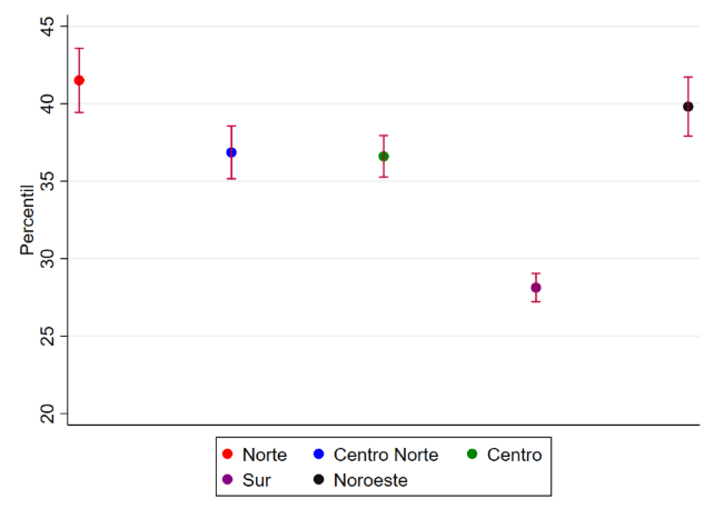 Figura 1: Posición socioeconómica esperada de acuerdo a la región de origen para los individuos cuyo origen es el percentil 25 de la distribución de activos del hogar