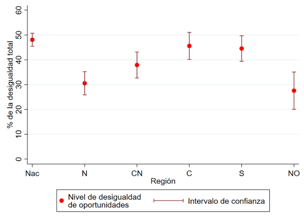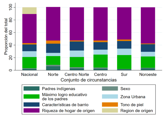 Ese componente tampoco es homogéneo entre regiones. En el norte y noroccidente del país, el peso mínimo de las circunstancias de origen es sustancialmente inferior, explicando alrededor de un tercio de la desigualdad observada. En cambio, en el centro y en el sur, este porcentaje alcanza cerca del 50 por ciento (46 y 45, respectivamente). Vale la pena señalar que el hecho de que el nivel nacional sea mayor se debe a la gran desigualdad entre las regiones.