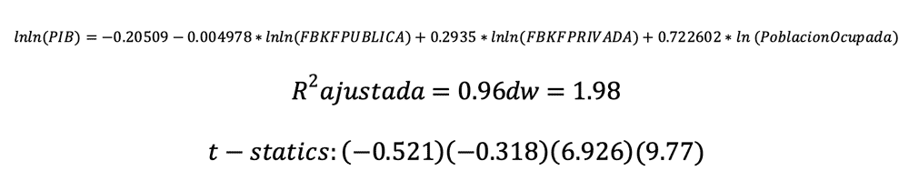 Los resultados muestran que el modelo que explica el comportamiento del PIB está en función de la formación bruta de capital fijo del sector público, es decir, la inversión en infraestructura, maquinaria y equipo del sector público, de la formación bruta de capital fijo del sector privado, y de la población ocupada.
