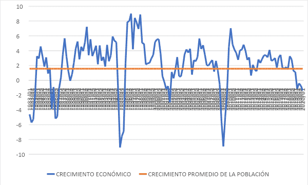 Desde que se realizó la reestructuración económica en 1983, México ha presentado tasas de crecimiento relativamente bajas y alrededor, acorde con datos del INEGI (2020), de 2.19 %. En términos per cápita y con una tasa de crecimiento poblacional alrededor del 1.56 % promedio según datos del propio instituto, implica que el crecimiento económico por habitante es de 0.63; es decir, casi nada. La importancia del PIB per cápita radica en que este muestra la calidad de vida en términos monetarios que podría alcanzar la sociedad con mecanismos adecuados de creación de empleos y redistribución, pero como se puede observar, en México, es muy bajo a pesar de que se cumpliera con estos mecanismos. Véase la gráfica 1.