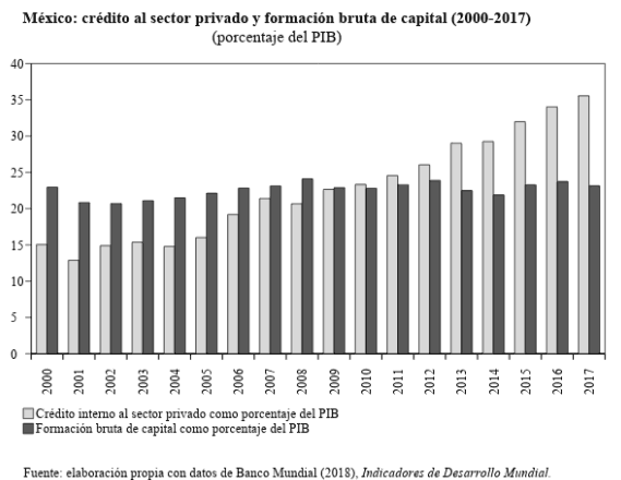 Para darnos una botanita de cómo se puede aterrizar empíricamente parte de la discusión teórica conducida hasta ahora, miremos en la gráfica 1 cómo se comportaron en los últimos años dos variables para el caso de México: a) formación bruta de capital, que comprende los desembolsos en concepto de adiciones a los activos fijos —como son las adquisiciones de maquinaria, equipo y la construcción de obras de infraestructura—, y b) crédito interno al sector privado, que refleja el monto de crédito concedido por los bancos que operan en la economía mexicana, ambos medidos como porcentaje del Producto Interno Bruto (PIB). En primer lugar, salta a la vista cómo la variación de la formación bruta de capital en los diecisiete años de la serie, dispuesto en las barritas más oscuras, es más plana que una tabla (arrancó siendo 22.96% en 2000 y representaba cerca de 23.13% del PIB en 2017). Mientras que, en el mismísimo periodo, hay un incremento sostenido del crédito bancario al sector privado (pasó de 15.03% en 2000 a 35.56% del PIB en 2017), entendiendo que la destinación de ese crédito creciente puede ser tanto “productiva” como “especulativa”. Sin embargo, y sin haber hecho ningún estudio refinado o más allá de la mera estadística descriptiva, uno puede arriesgar afirmar que el aumento reciente en la disponibilidad de crédito no catapultó la formación de capital. De hecho, la intensificación en el endeudamiento siquiera sirvió para sacar a la formación bruta de capital de su monótona horizontalidad.