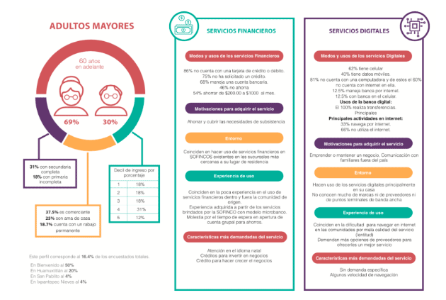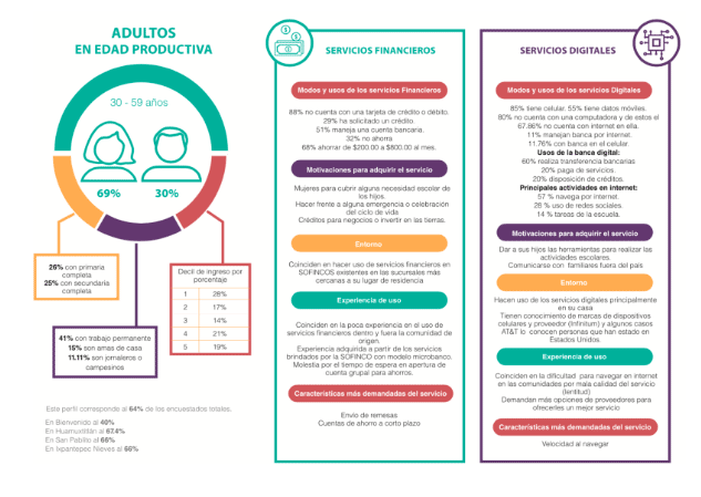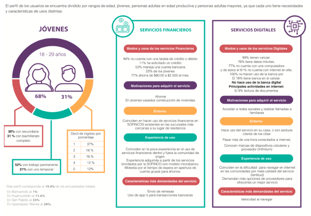 Igualmente, es fundamental considerar cuáles son los perfiles de usuarios dentro de las comunidades rurales, ya que si bien todos necesitan el acceso a internet y a los servicios financieros, el uso de éstos es para cumplir diferentes objetivos, dependiendo hacia quién vayan dirigidos. Dentro de la comunidad se identificaron perfiles de usuarios de acuerdo a rangos de edad, lo cual permitirá ponerlos a consideración de los tomadores de decisiones sobre todo cuando uno de los grandes objetivos de este gobierno entrante es dotar de servicios digitales o “internet gratuito a pueblos marginados”, y donde hacemos el hincapié acerca de que este servicio no sólo deberá manifestarse en infraestructura, sino también y principalmente en la calidad del servicio.