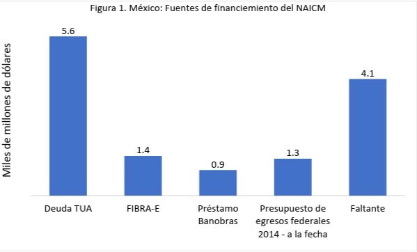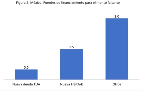 Como se ha señalado, ya hay seguros 9.2 mmd distribuidos de la siguiente manera: 1) 5.6 mmd en deuda emitida sobre la Tarifas Única de Aeropuerto (TUA) con una calificación de BBB+; 2) 1.4 mmd a través de un Fideicomiso de Infraestructura y Bienes Raíces (FIBRA-E) que cotiza en la Bolsa Mexicana de Valores (BMV); 3) un préstamo de Banobras por 0.9 mmd; y 4) 1.3 mmd provenientes de los presupuestos de egresos federales desde 2014 a la fecha. Los 3.99 mmd de dólares restantes se buscarían de la siguiente manera: 1) 0.5 mmd en deuda emitada una vez más sobre la TUA; 2) 1.5 mmd en nueva FIBRA-E y 3) 3 mmd a través de la concesión del Centro de Transporte Terrestre, la cancelación del contrato con ASA y de la monetización de terrenos del AICM. Esto quiere decir que además de completar el 30% restante, se busca dejar un margen por variación de costos de aproximadamente 0.9 mmd. Luego entonces, los recursos públicos totales invertidos en este proyecto representan el 10 por ciento del total y ya no habría necesidad de que la próxima administración utilizara nuevos recursos.