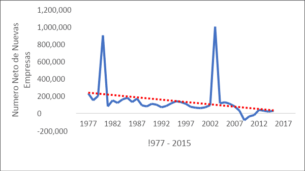 Desde los años 70, el número de nuevas empresas iniciando negocios ha descendido consistentemente. De acuerdo con una investigación del Buró de Censos,7 entre 1980 y 2014, la generación de empresas nuevas descendió en un 44 %. Aunado al menor número de empresas que nacen en este país, el número de empresas que desaparecen/mueren se ha incrementado. Restando al número de empresas nuevas el número de empresas que mueren (quiebran o desaparecen), nos da como resultado la creación neta de nuevas empresas. La siguiente gráfica presenta estos datos y muestra cómo hay un proceso de franca declinación.