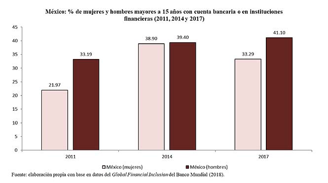Incursionando sin tacones en el primero de los senderos señalados, ya hemos escrito en otro lugar sobre las bajas tasas de bancarización y los exiliados del crédito en México, pero faltó entender que ese exilio no es para nada parejo, no hay mucha igualdad de género entre ese tipo especial de desterrados. Ellas, las que son las exiliadas del crédito, son quienes amargan la bocanada más insulsa del restricto pastel de la disponibilidad de crédito en nuestro país. Como podemos vislumbrar en la gráfica 1, con datos que nos dan el corte en tres periodos (2011, 2014 y 2017), queda patente cómo el porcentaje de mujeres mexicanas con acceso a una cuenta bancaria sigue siendo sustancialmente menor que en el caso de los hombres, con la excepción del año 2014 cuando la proporción en ambos casos era de alrededor del 40%. Sin embargo, el gustito de igualdad duró poco. En el periodo subsecuente, mientras que el porcentaje de hombres con una cuenta bancaria se ha incrementado de 39.4% a 41.1% entre 2014-2017, el mismísimo indicador, pero ahora tomando en cuenta a las mujeres, ha disminuido de 38.9% a 33.2%. No sería desubicado inferir que el sesgo de baja tasa de bancarización femenina está por detrás de la predilección de las microfinancieras privadas por ese público. Parafraseando un obscuro refrán, lo que la banca comercial tradicional no pela, las microfinanzas predatorias extorsionan hasta la última monedita que descansa solitaria en la alcancía.