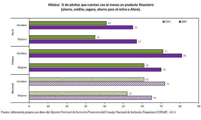 Es otra máxima popular que no hay dos sin tres. Así, si vamos un poco más allá del criterio “acceso a cuenta bancaria”, en la gráfica 2 podemos visualizar, con un poquitín más de detalle, cómo sistemáticamente las mujeres en México continúan teniendo una menor participación en la adquisición de diferentes productos financieros, como son las cuentas de ahorro tradicionales, la contratación de seguros y en la cotización junto a Administradoras de Fondos para el Retiro (AFORES). Para no perderse en el camino, seguimos desglosando la información para hombres y mujeres, pero fíjense que ahora los datos del año 2015 están en las barras color morado y las de 2012 en verde. Tomando en cuenta los datos a nivel nacional, el lector atento se dará cuenta que la situación de las mujeres mejoró de forma más acelerada que la de los hombres, si consideramos el paso de 2012 a 2015.  No sin dolor en el corazón, empero, el mismo lector prontamente observará que la brecha de género sigue, de tal forma que el porcentaje de adultos varones que tiene al menos uno de esos productos financieros fue de 72% en el año 2015, mientras que para mujeres fue de apenas 65%. En síntesis, que la cosa avanza, avanza. Sin embargo, si miramos la “foto” de la situación hoy (digo, en 2015, que es casi “hoy”, ¿no?), las mujeres, infelizmente, siguen dejadas para atrás también en el criterio de las finanzas personales.