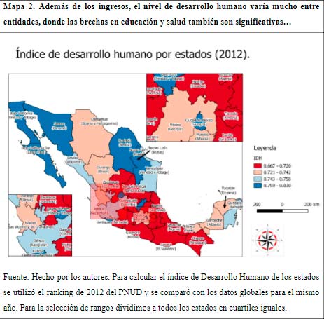 Mapa 2. Además de los ingresos, el nivel de desarrollo humano varía mucho entre entidades, donde las brechas en educación y salud también son significativas…