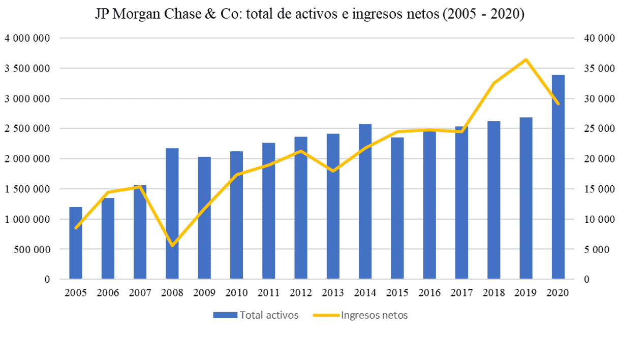 En la gráfica anterior se observa cómo, durante la crisis de 2008, los activos totales de JP Morgan Chase crecieron y, con el paso del tiempo, sus activos netos aumentaron después de la crisis financiera. En este sentido —aunque no se tienen los datos en la gráfica de Bear Stearns—, se puede apreciar cómo la adquisición de las acciones por parte de JP Morgan Chase repercutió positivamente para este gigante norteamericano, que sigue en pie aun durante la crisis del coronavirus sin tener caída en sus activos, pero sí una marcada tendencia a la baja en los ingresos netos.