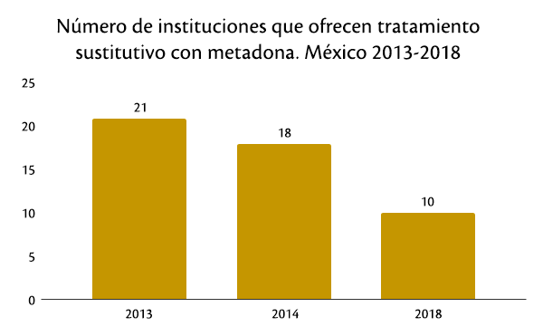 El número de instituciones que ofrecen tratamiento sustitutivo con opioides también ha disminuido de manera importante. Mientras en 2013 CENSIDA registraba la existencia de 21 instituciones en todo el país, en 2017 Cofepris sólo da cuenta de 10. A ello hay que sumarle los cierres por desabasto de medicamento que se reportan al menos una vez al año y frente a lo cual no existe un registro oficial del número de días en que estas instituciones estuvieron cerradas y las consecuencias de estos cierres en los procesos de deshabituación de las personas usuarias de estos servicios.