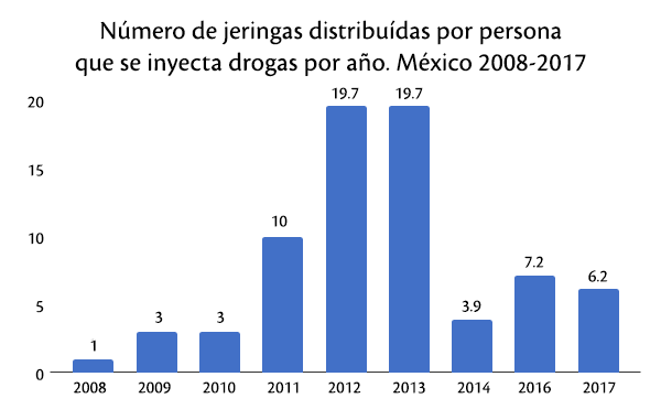 Así, aunque la distribución de jeringas ha sido una prioridad en las actividades de reducción de daños financiadas por CENSIDA, nunca nos hemos acercado a las 200 jeringas por persona que recomienda la Organización Mundial de la Salud (OMS), sin embargo, aun así las cosas han seguido empeorando. Entre 2013 y 2014 se logró el número más alto de distribución de jeringas (17), en el marco de la implementación del proyecto del Fondo Mundial para el fortalecimiento de la respuesta nacional al VIH/SIDA. En 2015 el mismo CENSIDA reporta una reducción del 30% en el volumen de distribución de este insumo básico y en 2017 se distribuyeron sólo seis jeringas por persona al año, número que a todas luces no favorece la prevención del VIH.