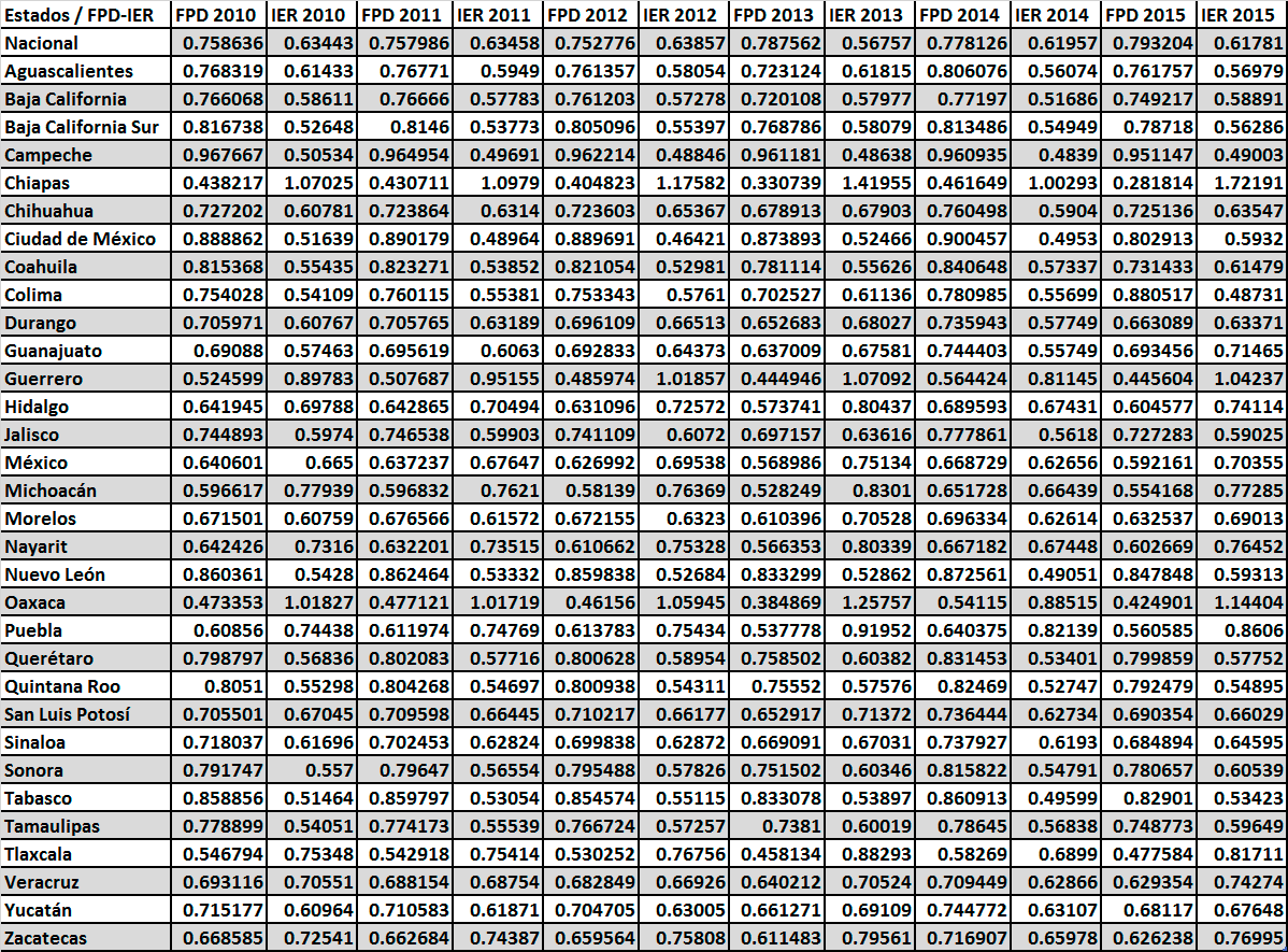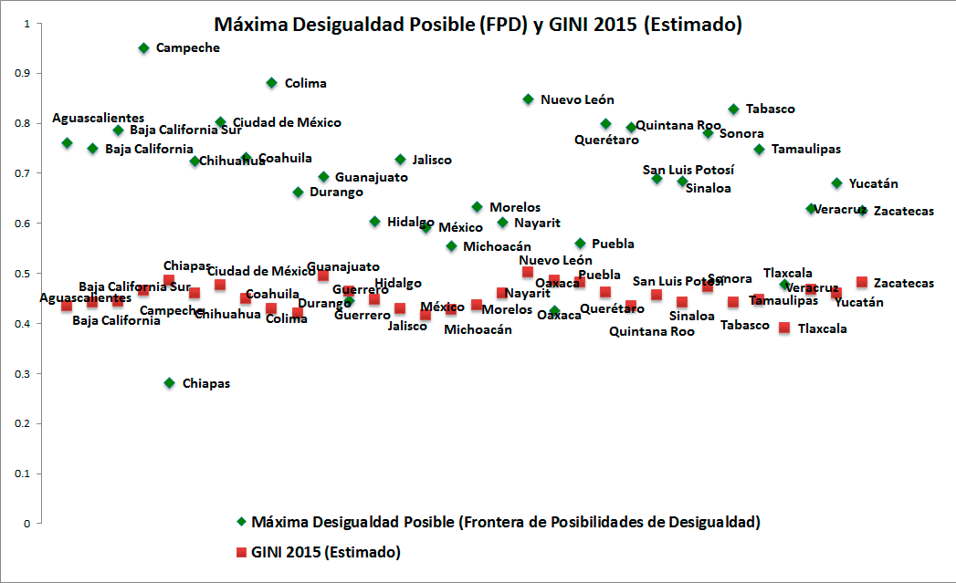 La tabla muestra los resultados de los cálculos de la Frontera de Posibilidades de Desigualdad (FPD) y la Tasa de Extracción de la Desigualdad (IER) de 2010 a 2015. Los resultados muestran que existe una muy marcada diferencia entre los niveles de desarrollo de los estados del sur y los estados del norte. Mientras que algunos estados como Nuevo León, Coahuila, Sonora y la Ciudad de México tienen FPD muy elevadas, superiores a .90, los estados más pobres como Chiapas, Oaxaca y Guerrero apenas tienen una FPD que ronda el valor de .75. Podemos observar que, en efecto, entre mayor es el desarrollo el valor de la FPD es más elevado.