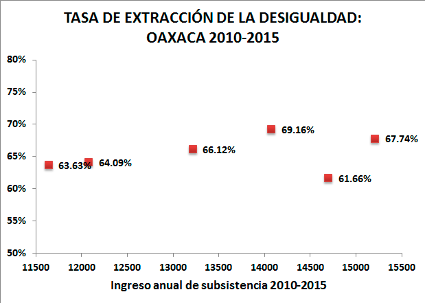 Con esta Línea de Bienestar encontramos las mismas tendencias, pero magnificadas. Los estados pobres en el sur, Chiapas, Oaxaca y Guerrero e incluso algunos no tan pobres como Puebla tienen tasas de extracción extremadamente altas, superiores al 100 por ciento para los primeros tres y cercanas al 90 por ciento para Puebla. Estas tasas de extracción tan elevadas nos ayudan a comprender cómo es posible que, a pesar de que la desigualdad parece tan estable, se han registrado incrementos en el número de personas en situación de pobreza durante muchos años. Más que un incremento de la desigualdad, lo que se observa es el empobrecimiento de esas economías: la pobreza incrementa porque la desigualdad en sus distintas formas sigue creciendo.