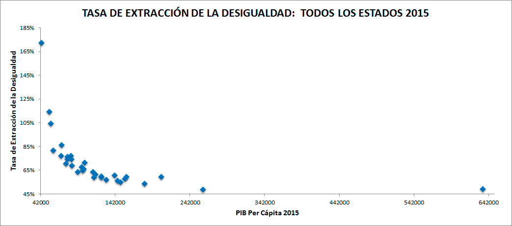 La misma tabla nos dice que las tasas de extracción de los estados más ricos son relativamente normales alrededor del valor de 50 por ciento, sin embargo, para los estados más pobres esas tasas superan el 60 por ciento y, en casos extremos como el de Chiapas en 2015, llegan hasta casi el 75 por ciento. Para ponerlo en contexto, niveles superiores al 60 por ciento son equivalentes al del Imperio Romano en el año 14 AD con 75 por ciento, la Inglaterra y Gales de 1290 con 69 por ciento, la Toscana de 1427 con 66 por ciento, Holanda de 1732 con 71 por ciento o Brasil de 1872 con 74 por ciento.10 Si bien estos valores no son estrictamente comparables, ya que lo que consideramos un ingreso de subsistencia es mayor hoy que el ingreso de subsistencia en esas sociedades (alrededor de 300 dólares de 1990 al año), sí nos da una idea relativa de la magnitud del nivel de extracción. En pleno siglo XXI tener regiones con niveles de desigualdad comparables con sociedades tan desiguales no es una comparación halagadora.