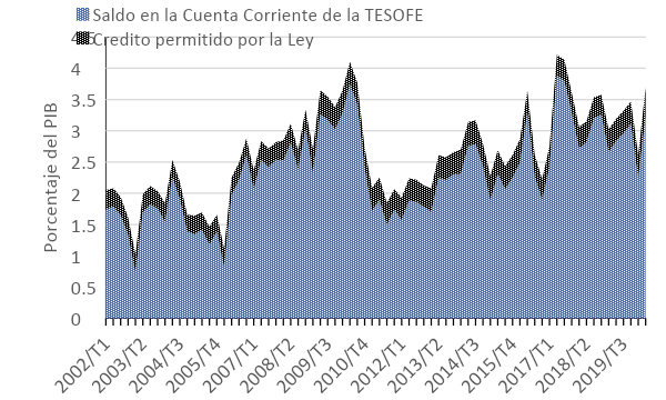 El crédito relacionado al 1.5 % del PEF, que el gobierno federal podría utilizar en 2020 a través de su cuenta corriente con el Banco de México, es cercano a los 82 000 millones de pesos, sin tomar en cuenta las “circunstancias extraordinarias”. Se trata de un crédito mayor, por ejemplo, que el monto de recursos que serán reintegrados a la Tesorería por la polémica extinción de los fideicomisos recientemente aprobada por el Congreso. A estos recursos se debe añadir el saldo positivo que el Gobierno actualmente tiene en esta Cuenta que, como se ha dicho, al final del mes de septiembre de este año ascendía a 607 000 millones de pesos. La Figura 1 muestra los recursos disponibles a través de la Cuenta Corriente de la Tesorería, medidos como porcentaje del PIB, sin tomar en cuenta las “circunstancias extraordinarias” previstas por la Ley.