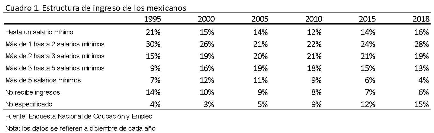 El porcentaje de mexicanos que gana más de cinco salarios mínimos ha disminuido considerablemente. Mientras que en el 2000 alrededor de 12 % tenía ingresos por encima de este umbral, en 2018 sólo 4 % lo hacía. Esta disminución se explica, en menor medida, por un incremento marginal del salario mínimo. Más bien, el estancamiento económico, aunado a la flexibilización de las leyes laborales, ha degradado la calidad de los empleos. En 2018, 16 % de los encuestados ganaba hasta un salario mínimo, que en términos monetarios representaba una cifra inferior a 2651 pesos mensuales. Más allá de eso, 76 % ganaba menos de cinco salarios mínimos, que en términos monetarios ascendía a 13 256 pesos; esto es, casi 80 % no tenía un ingreso suficiente para satisfacer a cabalidad las necesidades de sus familias.