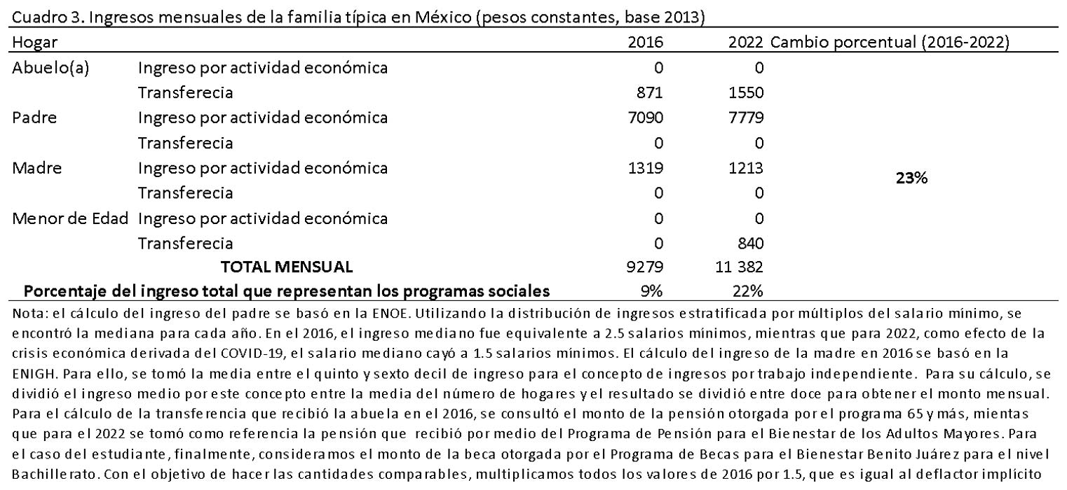 El cuadro 3 muestra que el ingreso de la familia mexicana típica aumentó 23 % en términos reales entre 2016 y 2022. Es decir, aun descontando la crisis del covid-19, los programas sociales han incrementado significativamente el ingreso de la unidad familiar. ¿Esto es populismo? No si consideramos que México es el país de la OCDE que menos gasta en desarrollo social. De hecho, el gasto en este rubro (como porcentaje del PIB) es de alrededor de la mitad del de Costa Rica, Chile o Colombia. Los programas sociales, por descontado, tienen muchas áreas de oportunidad. No dejan de llamar la atención, sin embargo, las acusaciones de “populista” por implementar una tibia política de desarrollo social que no ha implicado un desbalance de las cuentas fiscales. Debemos enfatizar dos puntos. Primero, ese gasto social se logró a costa de una reasignación importante del presupuesto público, lo que implica descuidar funciones sustantivas del precario Estado mexicano. Por el motivo que sea, el presidente fue renuente a utilizar su capital político para implementar una reforma fiscal progresiva, la más importante de las asignaturas pendientes. Segundo, debido a la caída de la actividad económica, el porcentaje del ingreso de las familias que depende de programas sociales creció, tendencia insostenible en el largo plazo.