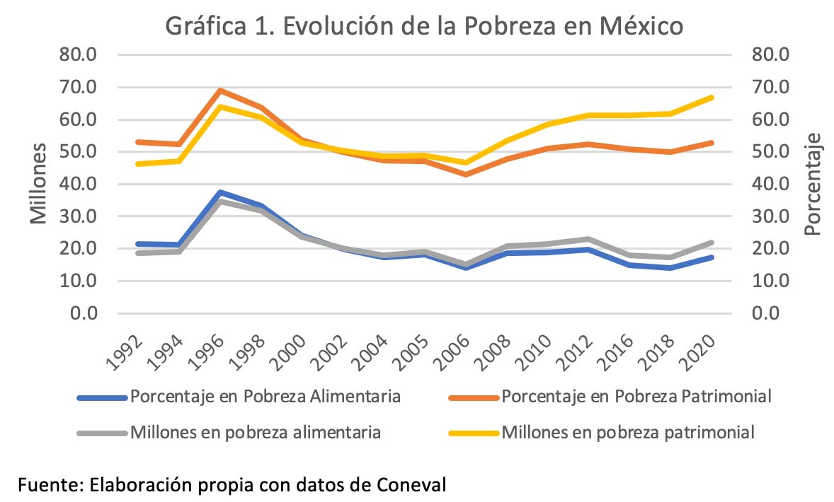 Empezamos 1992 con 53.1 % de la población en pobreza patrimonial y 21.4 en pobreza alimentaria; en 2018, las mismas variables representaban 49.9 y 14 %. Si bien en términos relativos hubo una disminución marginal de la pobreza, el ejército de pobres no dejó de crecer. En 1992, había 46.1 millones de mexicanos en pobreza patrimonial y 18.6 en pobreza alimentaria; en 2018, ya eran 61.8 millones en la primera condición y 17.3 millones en la segunda. Ni el programa estelar de desarrollo social, ni las políticas asistencialistas, ni el escaso crecimiento económico redujeron la pobreza. Además, nuestras recurrentes crisis económicas borraron de un plumazo los escasos logros en esta materia, tal y como ilustran la del “Efecto Tequila” o la más reciente provocada por el “Gran Confinamiento”. Así de efímero es el “desarrollo” en nuestro país.