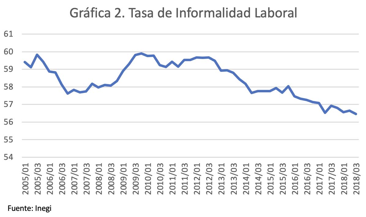 Como cabría esperar, el mercado laboral resintió el escaso crecimiento económico. De acuerdo con las cifras oficiales, México ha mantenido tasas de desocupación de un solo dígito en las últimas décadas, incluso si tomamos en consideración la crisis financiera global de 2008. La tasa de desempleo reportada por el Inegi no refleja la totalidad del mercado laboral mexicano. Por eso, es preciso enfocarse en variables como la informalidad, que consiste sobre todo en actividades de subsistencia realizadas por personas que fueron expulsadas o nunca pudieron incorporarse al mercado laboral formal.
