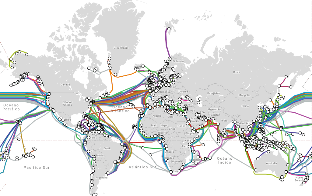 En la última década se ha dado un aumento exponencial en la fibra óptica de cables submarinos, pues del 99 % del total de datos internacionales las transmisiones pasan por estos cables (Bischof et al., 2018). Las empresas de tecnología están invirtiendo cada vez más en tales cables y los proveedores de contenido (como Microsoft, Google, Facebook y Amazon) ahora poseen o arriendan más de la mitad de todo el ancho de banda submarino.