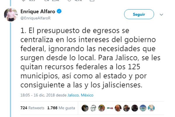 Otro grupo, con mucho menos respaldo que las escuelas públicas, ha sido el de los gobernadores de Jalisco, Chihuahua, Aguascalientes, Tamaulipas y Baja California. En casos específicos, como Enrique Alfaro, Gobernador de Jalisco, quien escribió sobre el presupuesto en su cuenta de Twitter el 16 de diciembre, diciendo que con este plan se centraliza el gobierno federal y se ignoran las necesidades que surgen desde lo local y se les quitan recursos a los municipios, al estado y a los jaliscienses.