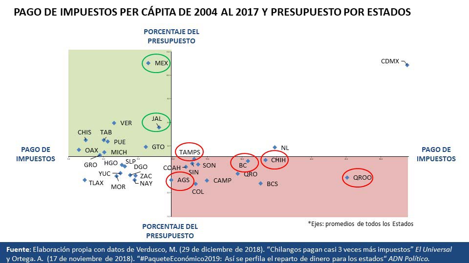 En una evaluación del pago de impuestos per cápita con respecto al porcentaje de presupuesto que recibirá cada entidad, se observa que la Ciudad de México, así como Nuevo León, se ubica en un cuadrante que pudiera denominarse como “justo” dado que pagan más impuestos que la media nacional y también reciben poco más del promedio de presupuesto.