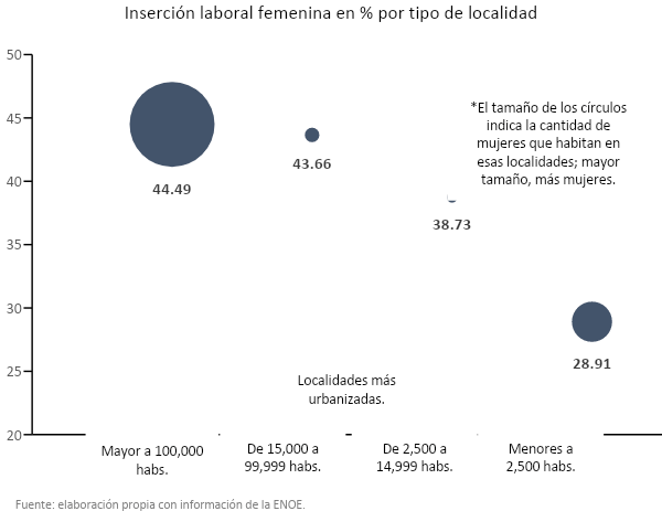 Tres factores pueden estar determinando la segunda tasa más baja de todo el continente, la cual pareciera estar estancada entre la segunda y tercera etapa de la Curva de U: 1) estructura y actividad económica; 2) educación y demografía; 3) tradiciones o factores institucionales. El cambio del rostro productivo hacia uno más industrial provocó mayor inclusión de mujeres en las manufacturas y las recurrentes crisis económicas de la década de los ochenta provocaron el surgimiento de un sector de comercio informal precario feminizado, a menudo como colchón de la economía formal… y del empleo masculino. Los hogares rurales son una historia muy distinta; aunque pareciera lo contrario, sus ingresos son relativamente altos, lo que ha permitido que se asuma el costo de que las mujeres desempeñen trabajo no remunerado en el hogar debido a básicamente dos fuentes de ingresos: las remesas7 y las transferencias de gobierno. Este grupo todavía es representativo, pues concentra poco más de 11 millones de las 52 millones de mujeres que están dentro del mercado laboral; la participación laboral femenina en las zonas rurales es de 28.91% comparado con el 44.49% de las urbanas.