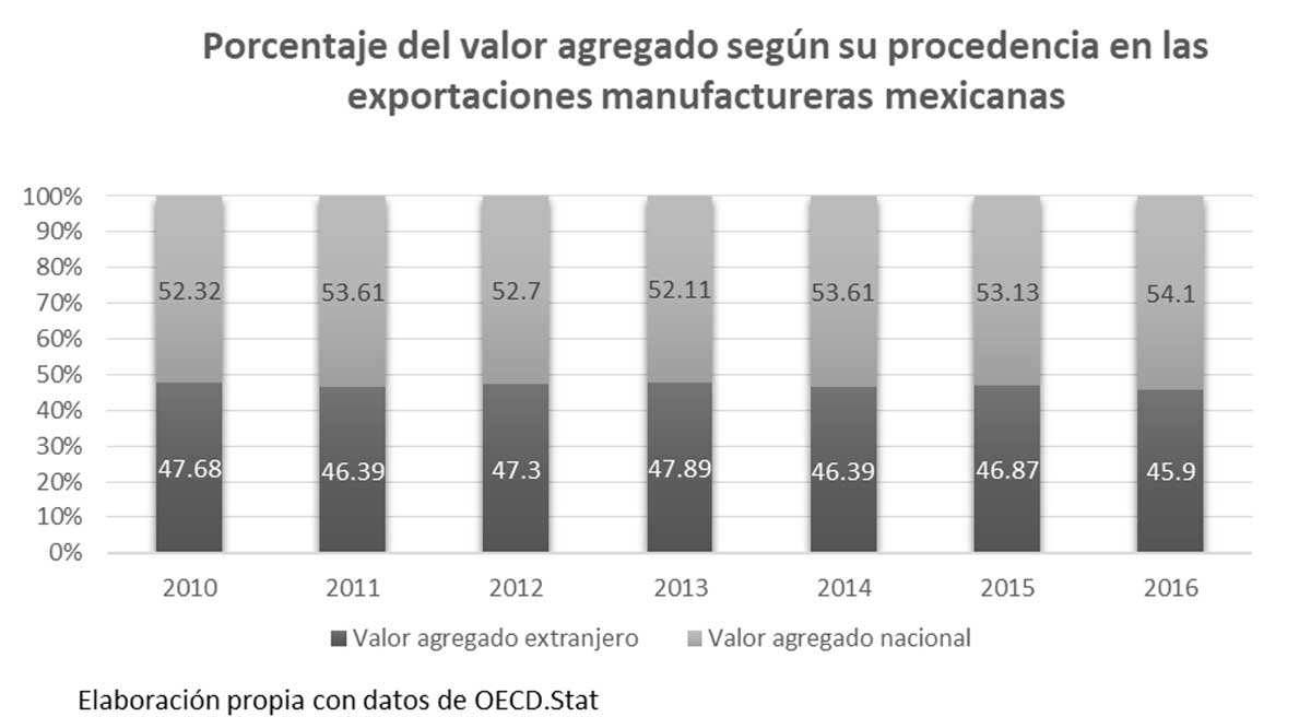 En la gráfica anterior se observa el total del valor agregado de productos manufactureros que se exportaron desde México en el periodo de 2010-2016, específicamente, según su procedencia. El resultado fue que el VA producido por empresas establecidas en territorio nacional tuvo un crecimiento de casi dos puntos porcentuales en este periodo, lo que indica que ha existido un incremento en el beneficio nacional; sin embargo, como se observa en la gráfica, el incremento entre años ha sido muy bajo e incluso con reducciones, como en los años de 2012 a 2013 o de 2014 a 2015. También se puede decir que existió una dependencia casi uno a uno en la producción con las empresas extranjeras; si bien se redujo, los beneficios se siguieron dividiendo casi a la mitad. En general, podemos decir que México se ha vuelto más eficiente en el papel de la cadena, mas no que haya ascendido dentro de ésta.