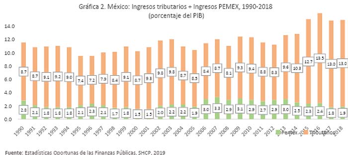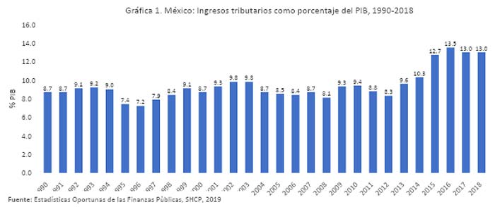 Esta encrucijada nos recuerda que México ha postergado año con año, y sexenio tras sexenio, una auténtica reforma fiscal que dote al Estado de los recursos suficientes para atender sus funciones. Prueba de lo anterior es que, de acuerdo con la SHCP, de 1990 a 2018 el promedio de recaudación tributaria como porcentaje del PIB fue de 9.4% y al cierre de 2018 fue de 13% (ver gráfica 1); sin embargo, de acuerdo con la Organización para la Cooperación y el Desarrollo Económicos (OCDE), el promedio de la región de América Latina fue de 23.1%, el promedio de los miembros de la OCDE fue de 34% y la media del continente africano fue de 19.1%. Es decir, nuestras tasas de recaudación tributaria son de las más bajas del mundo y sólo son comparables con las tasas que registran países con ingresos per cápita inferiores a nosotros, como por ejemplo, la República Democrática del Congo, Uganda, Indonesia, Guatemala y República Dominicana.