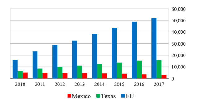 A manera de ser más específico, es el etano7 proveniente de Texas la molécula que está transformando la costa estadunidense del Golfo de México, a donde se estima que han llegado inversiones de alrededor de 140 mil millones de dólares para expandir y construir plantas para producir etileno y derivados como el polietileno y el propileno.8