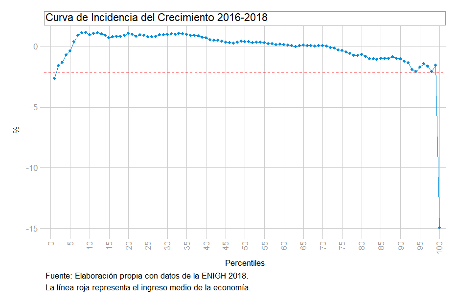 En este sentido, la desigualdad del ingreso en 2018, medida a través del Índice de Gini, fue de 0.4378, menor a la de 2016 con un índice de 0.4633. Es decir, la evidencia mostrada hasta ahora sugiere que la caída en el ingreso medio, asociada a un decremento de los más ricos, redujo la desigualdad en casi tres puntos de Gini, ello indica que la distribución está tendiendo a ser más justa por el simple hecho de un menor crecimiento general y de un menor crecimiento del grupo más rico. Sin embargo, es difícil creer que la inequidad realmente esté disminuyendo por diversas razones: