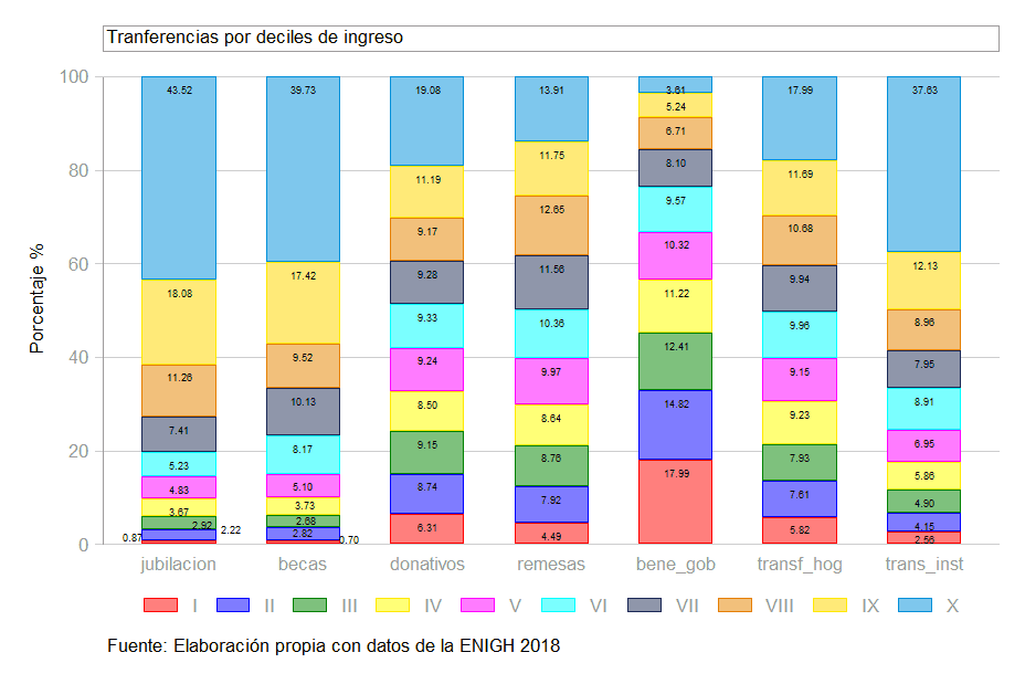 Las transferencias que más benefician a la población son las remesas y beneficios gubernamentales; los donativos parecen tener una distribución parecida (al menor del decil dos al nueve). Por último, las transferencias institucionales se concentran en su mayoría en el último decil, mientras que las de hogares son similares para el 80% de la población.