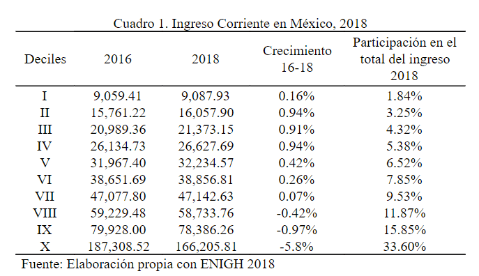 En 2018, el ingreso corriente promedio por hogar fue de 49,470.64 pesos,1 lo que significó un decrecimiento medio anual del 2.10% con respecto a la encuesta previa de 2016. Ahora bien, si dividimos a la población por deciles de ingreso, podemos observar que esta caída en el crecimiento medio trajo consigo tanto a ganadores como perdedores. Mientras que los primeros siete deciles presentaron una ganancia de crecimiento de su ingreso positiva, aunque menor al 1%. Los últimos tres deciles de la distribución muestran una caída, sobre todo el decil 10, el de mayores ingresos, con una pérdida del 5.8. ¿Qué explica este hecho?